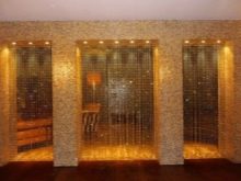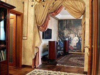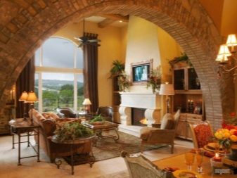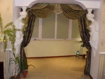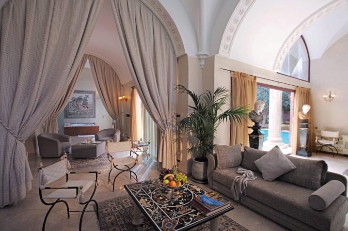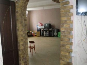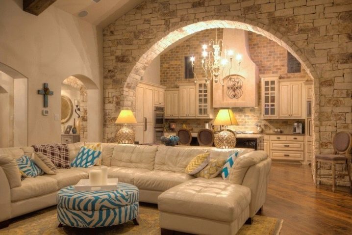 В този случай арките също са украсени с красиви завеси или светли завеси. Покрай тях можете да поставите необичаен модел, изработен от естествен камък.