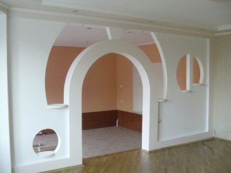 - Гипсокартон. Арките от гипсокартон се отличават със своите изящни форми и интересен дизайн. По този начин можете да проявите въображение и да създадете продукти с най -необичайна форма със собствените си ръце. Гипсокартонът е много лек материал, можете да работите с него сами.