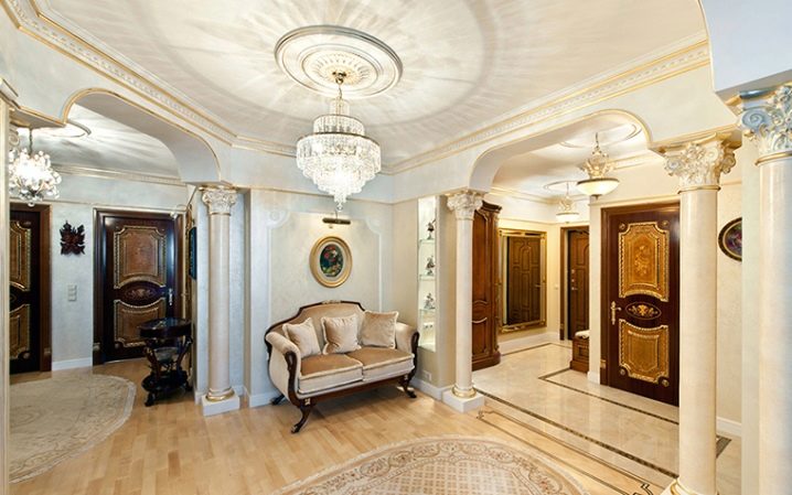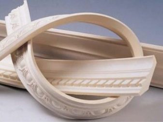 - Полиуретановото формоване на такива конструкции изглежда много луксозно. Тя ви позволява да създадете аналог на класическата структура с колони. Полиуретановите корнизи са доста здрави и плътни, поради което могат да служат много дълго време..