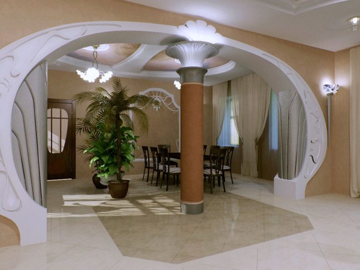 Арките в стил романтизъм или класика могат да бъдат украсени с мазилка. Можете дори да украсите барокова стая по този начин. Мазилката може да бъде направена под формата на колони, красиви форми. Такъв сводест дизайн може да се различава при балерините..
