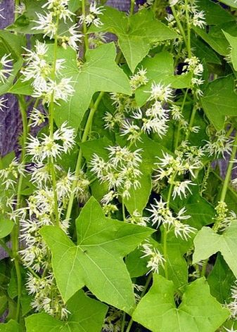Ехиноцистисът е лопастен. Едно от най -непретенциозните катерещи растения, познато на всички от детството. Подходящ е за отглеждане на балкон с всякакво ниво на осветеност. Големите меки листа създават приятен нюанс, а белите пискюли на цветята имат ненатрапчив аромат на мед. Това е чудесен вариант за начинаещи градинари, които просто се опитват..
