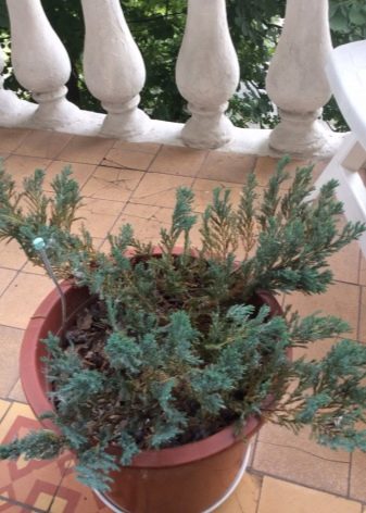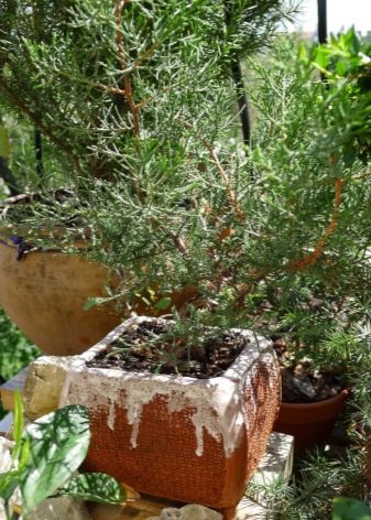 Хвойна и туя. Тези вечнозелени многогодишни иглолистни дървета обичат слънчевата страна. Те са удобни, защото растат много бавно (3-5 см годишно) и не изискват чести трансплантации, но обичат да се хранят с минерални торове. Короната им е доста пластмасова и може да й се придаде всякаква форма. Горната част понася добре отрицателните температури, но е по -добре да покриете саксиите за зимата с полистирол, така че корените да не замръзнат.