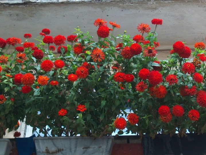Zinnia. Едногодишно или многогодишно растение с големи, многолистни, обемни цветя с различни цветове – бяло, червено, жълто, оранжево. Цъфти от август до първото студено време. Обича слънчева светлина и богата на хумус почва. Някои видове могат да достигнат височина до 90 см, но циния-карлик се препоръчва за балкон-не повече от 30 см. Циния-карлик цъфти толкова великолепно, че зелената му част е почти невидима. Изисква предварително отглеждане на разсад.