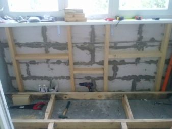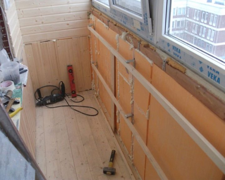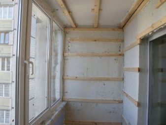 Облицовката на балкона с дъска по същество започва от този етап. За да направим това, ние създаваме рамка от греди по периметъра на стените, дебелината на всяка дъска трябва да бъде с 1,5-2 см по-голяма от дебелината на топлоизолацията, за да се осигури вентилация на облицовката. При подход “бюджет” това правило е леко нарушено: материалите за обшивката се вземат със същата дебелина като изолацията или малко по -широка, а след това към основната рамка е прикрепена контрарешетка – същите ламели, но перпендикулярно. Това създава необходимия въздушен джоб, но ще има повече работа..