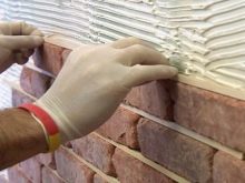 - С помощта на гребен лепилото първо се нанася върху стената., след това върху довършителни материали.