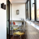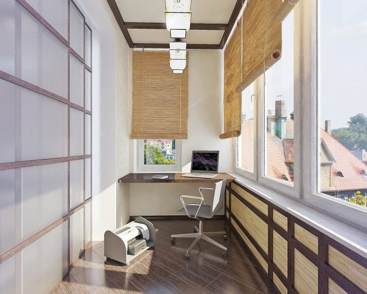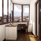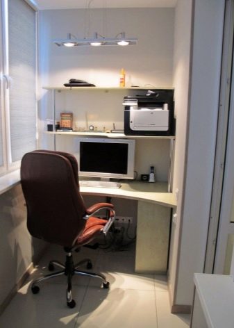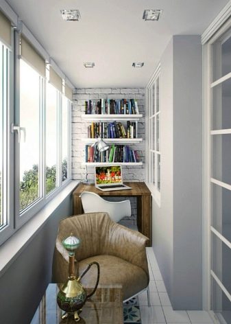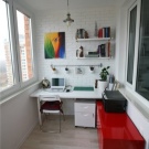 Проучване. Това е необходимо за тези хора, които работят от вкъщи. Следователно офисът трябва да бъде оборудван с всичко, което може да е необходимо. На първо място, трябва да поставите бюро, на което ще стои компютър или лаптоп. Масата трябва да бъде с такъв размер, че да се побира свободно върху лоджията и да не пречи на прохода.