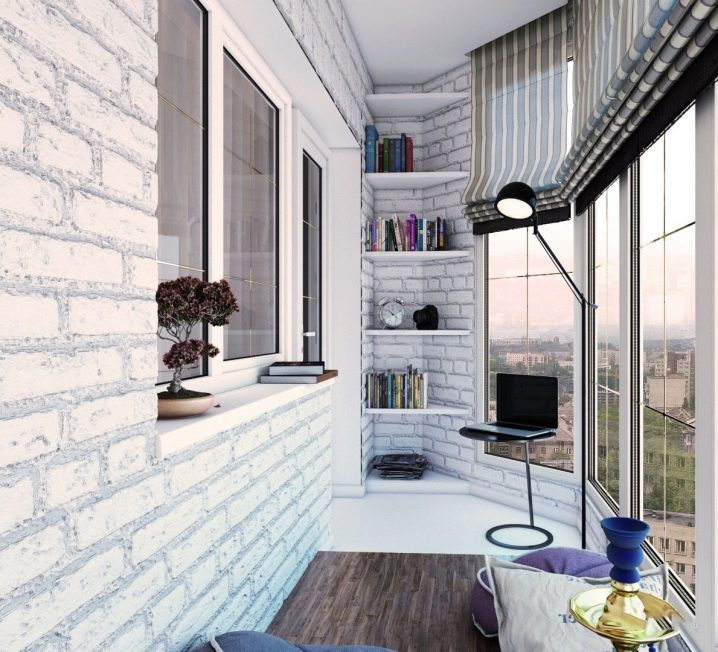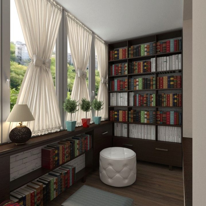 Библиотека. Любителите на литературата вече няма да държат огромно количество книги и списания в апартамента си. Лоджията е чудесно място за рафтове с книги. И за да стане пространството уютно, върху него се поставя малък диван..
