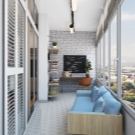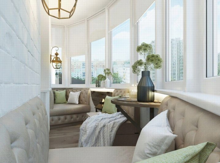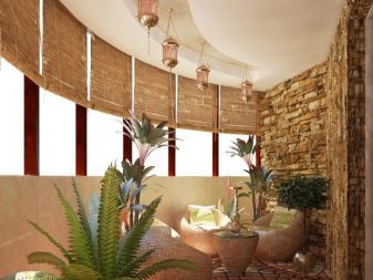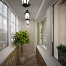 Ъглов дизайн на лоджия. Като правило ъгловият балкон е голям, така че можете да го подредите както искате. Това може да бъде оранжерия или зона за отдих. В тясната част на лоджията можете да окачите саксии с растения.