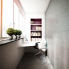Модерен стил. Стените са обшити с декоративни панели, на пода е поставен линолеум или са поставени плочки. Таванът е боядисан в бяло или млечно.