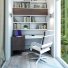 Ако стаята е твърде малка, тогава можете да закупите компактна маса и да окачите монитора на стената. Рафтове за книги и документи се монтират над работното място. Можете да поставите скенер или принтер върху тях.