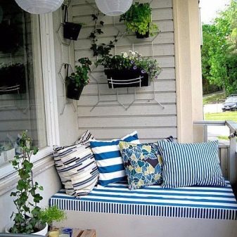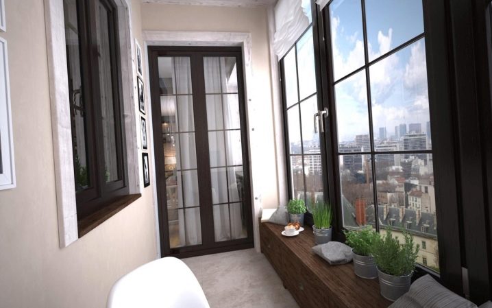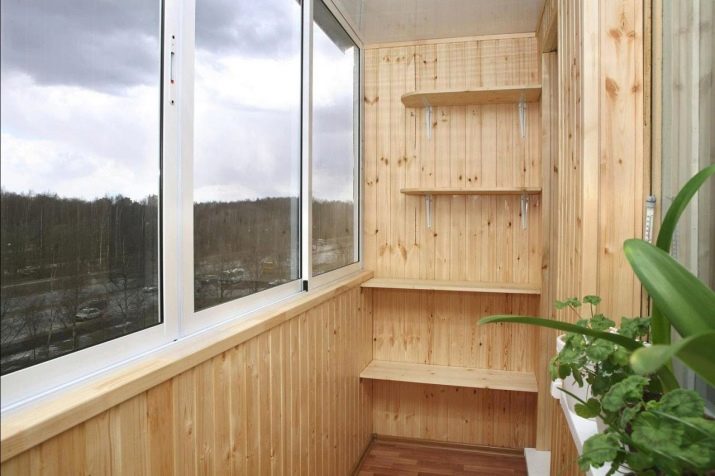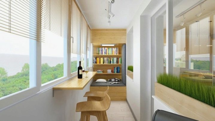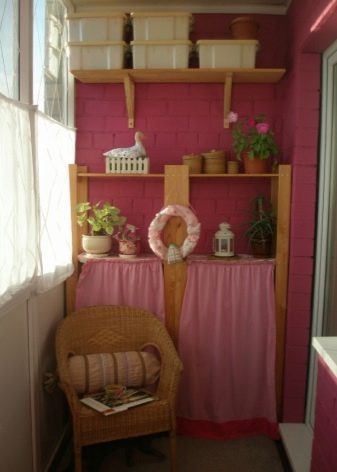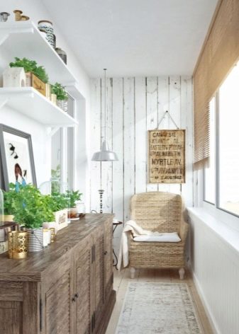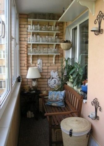 За организиране на пространството се монтират рафтове или перваза на прозореца. Те трябва да бъдат оразмерени, така че да не пречат на преминаването. Ако лоджията е голяма, тогава върху нея се поставя шезлонг..