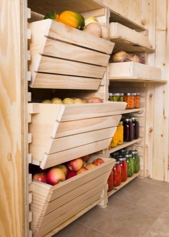 За да се съхраняват консерви или къдрици, рафтовете се монтират отстрани на килера. Те трябва да са силни, за да издържат на голямо тегло. От друга страна, те поставят шкаф за съхранение на инструменти или неща..