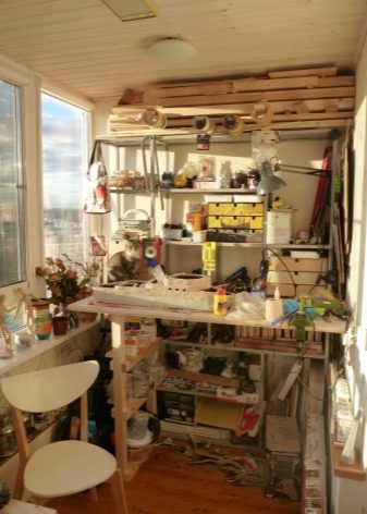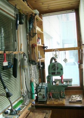 Работилницата трябва да има здрава и стабилна маса с чекмеджета. Всичко, от което се нуждаете, трябва винаги да е под ръка. По периметъра на лоджията можете да инсталирате рафтове за инструменти и да поставите лампа на масата.
