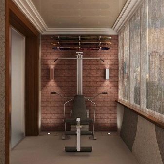 Фитнес зала – мини зала. Ако зоната позволява, тогава на балкона можете да инсталирате велоергометър, гимнастическа стена, да поставите постелки на пода. Те окачват огледало на стената и прикачват радио, за да направят часовете по -интересни.