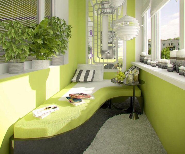 Играта на контрасти изглежда красива. Така например, ако лоджията има светли стени или под, тогава мебелите се избират в ярък цвят. Това може да бъде зелена маса и зелени столове или матрак. Основното нещо е да не прекалявате с ярки акценти, за да не загубите индивидуалността на стаята..