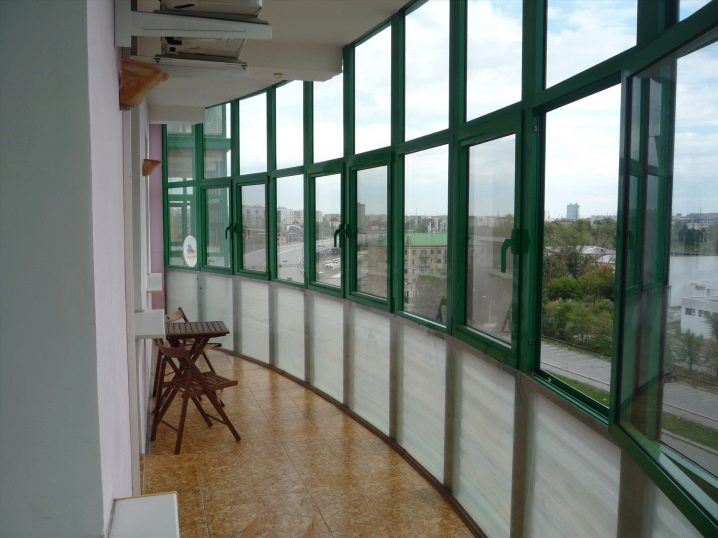 По -нататъшното му подреждане зависи от формата на лоджията. Балконът изглежда оригинален в полукръг или трапец. Стъклото се поставя прозрачно или оцветено. Можете да остъклете долната част с тъмно стъкло, а горната с прозрачно или да направите прозорците зелени.