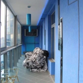 Стените на лоджията могат да бъдат изложени с тухли или залепени с плочки. Много хора боядисват стените си в ярки цветове като червено и синьо. Но такава пъстра версия трябва да се разрежда с мебели в успокояващи цветове. Например бял диван и стъклена маса.