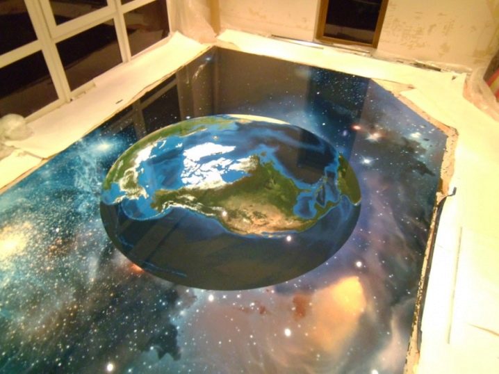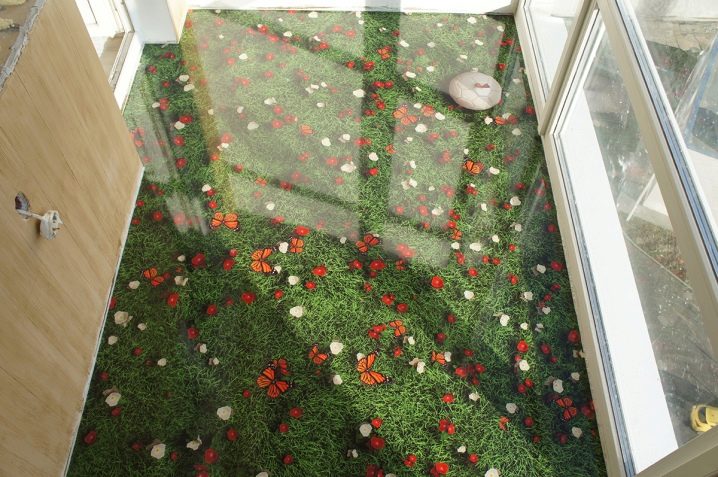 Такъв под е лесно да се направи със собствените си ръце. Първоначално е необходимо да запълните пода с течна основа от светъл или неутрален цвят. След това използвайте валяк, за да покриете с боя. След това нанесете втори слой боя, той може да бъде в други цветове. И накрая, залепете чертежа, закупен в магазина.