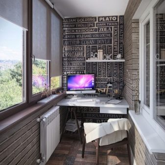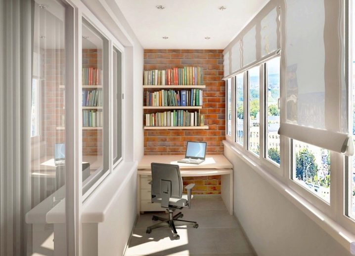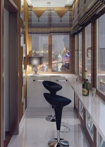 На изолираната остъклена лоджия можете да оборудвате пълноценно кабинет: инсталирайте бюро, поставете компютър или лаптоп върху него, окачете рафтове за документи и литература на стената. Ако вашият балкон граничи с кухнята и площта му е достатъчно голяма, подредете там трапезария, като я оборудвате с уютна трапезария. Също така е много готино да използвате топла балконска стая като детска стая за игра-просто не забравяйте да оборудвате прозорците с плътно прилепнали и труднодостъпни болтове.