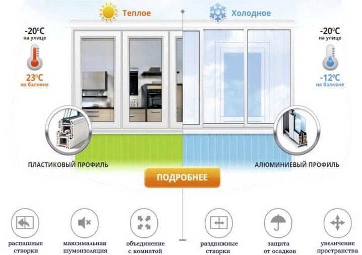 Можете да намерите алуминиеви профили със студено или топло остъкляване. В първия случай алуминиевата основа се допълва от единично стъкло, а във втория се допълва от така наречения термомост. Това е специална топлоизолационна вложка, която ви позволява да запазите максимална топлина в помещението. Конструкцията от метален профил е много по -лека от пластмасата.