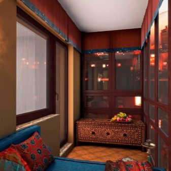 Достатъчно голям балкон или лоджия (от 3 до 6 метра) ще бъде чудесно място за почивка, ако поставите диван, фотьойли или пейка с масичка за кафе там. Можете също така да подредите там наргиле бар в ориенталски стил: поставете дебел матрак, плетени килими и ярки възглавници на пода, поставете наргиле до него и украсете стените с мотиви от „Хиляда и една нощ“.