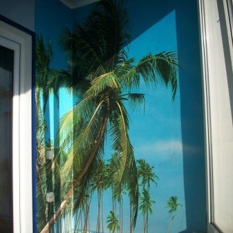 - За да създадете илюзията за релакс на тропически плаж или визуално разширяване на пространството, можете да залепите фототапет със съответната картина на балкона. Поставете пейка или диван пред себе си и се насладете на красивите гледки в приятна компания или сами;