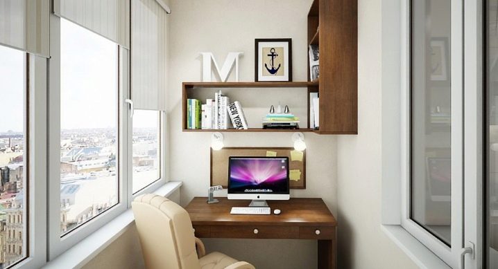 - Ако сте подготвили балкон за поставяне на личен акаунт в него, настройте бюро, окачете рафт за документи над него, поставете компютър или лаптоп;
