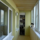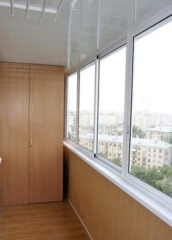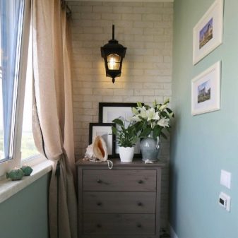 На такава територия на балкона доста успешно може да се постави вграден гардероб от тавана до пода. Във всеки случай си струва да се даде предпочитание на леки модели, които няма да скрият визуално и без това тясно пространство. Огледалните повърхности на мебелите ще ви помогнат да направите мебелите по -ефирни и леки..