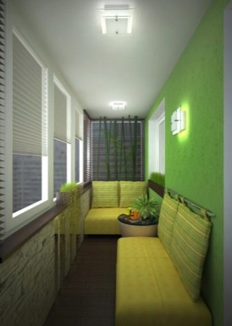 Понякога дизайнерите предлагат много креативни и нестандартни проекти за декориране на балкон. За слънчевата страна тревно-зелената гама от тонове е перфектна. Ъгловият диван ще служи като удобно място за почивка. Изключителните полилеи на верига и огледални повърхности ще придадат на стаята с балкон свой уникален стил. Мекият килим със сребрист цвят ще смекчи бунта на зелените цветове. И, разбира се, дизайнът ще изглежда недовършен без свежи цветя в саксиите..