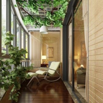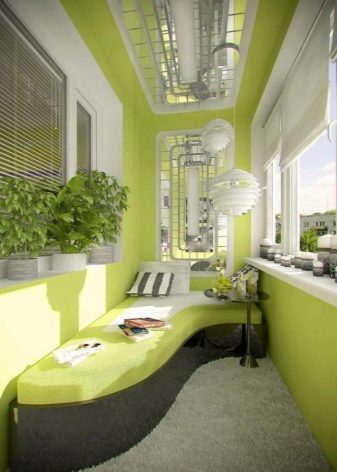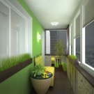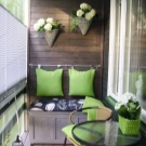 Понякога дизайнерите предлагат много креативни и нестандартни проекти за декориране на балкон. За слънчевата страна тревно-зелената гама от тонове е перфектна. Ъгловият диван ще служи като удобно място за почивка. Изключителните полилеи на верига и огледални повърхности ще придадат на стаята с балкон свой уникален стил. Мекият килим със сребрист цвят ще смекчи бунта на зелените цветове. И, разбира се, дизайнът ще изглежда недовършен без свежи цветя в саксиите..