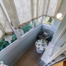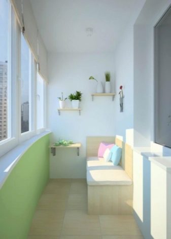 - Сгъваемите мебели са идеални за наклонен балкон, за да се спести място. Не забравяйте за стените, които можете да украсите със снимки, рамки или магнити от вашите пътувания. На такъв балкон организирането на зимна градина би било чудесна идея. Нестандартно пространство може да бъде украсено с ярки и елегантни аксесоари под формата на възглавници, одеяла и цветя. На балкона с наклонен дизайн, малки столове и маса или малък диван с място за неща ще се поберат напълно. Кремовите цветове са най -подходящи за декорация на стени и подове..