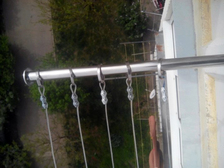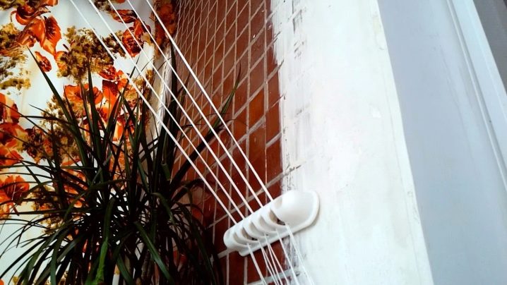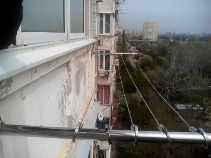 Ако говорим за външна сушилня, която се монтира извън балконската зона и зад нея, тогава основният й плюс, разбира се, е, че изобщо не претендира за балконско пространство. Устройството представлява конзолна конструкция от два профила, фиксирани на балкона и въжета, опънати между тях.