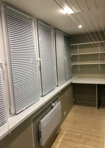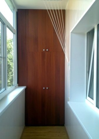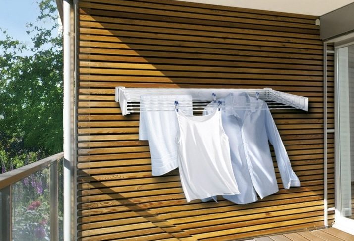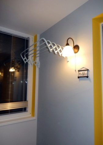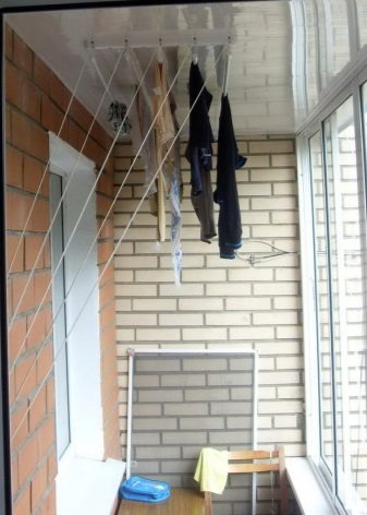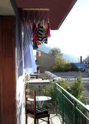Собствениците избират мястото, където ще бъде инсталирана конструкцията, като по този начин е възможно да се раздели балконското пространство на зона за отдих и работна зона. През зимата, ако не искате прането да замръзне (въпреки че след това мирише толкова приятно на озон), тогава сушилнята може да бъде инсталирана в банята..