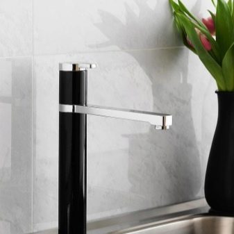 Той ще бъде хармонично съчетан с бяло и черно и с цветове на по -ярка палитра. Ако стаята е доминирана от блясък, тогава е по -добре да изберете миксер със същата повърхност. Ако присъстват само гланцови елементи, тогава можете да изберете смесител с гланцови и матови повърхности. Добра комбинация би била черен кран и мраморни или гранитни плотове. Такъв тандем ще подчертае изяществото и някакво величие на кухненската стая..