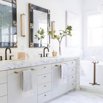 Специално внимание ще бъде привлечено от смесителя с бронзов вид, ако в помещението има подобни елементи.. Най-популярните видове смесители за баня са вградени, комбинирани и монтирани на стена. Основната характеристика на вградените кранове е независимостта от изхода за вода, така че те могат да бъдат инсталирани навсякъде. Комбинираният вид се отличава с доста гъвкава основа, поради което може да се използва едновременно както за банята, така и за мивката. Такива продукти също имат минус – това е постоянно спиране на водата, когато тя се прехвърля от ваната към мивката. Стенните кранове се считат за класическата версия, която е оборудвана с гъвкав маркуч и душ глава..