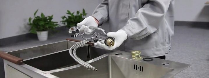 По време на подготвителната работа първо трябва да прокарате гъвкавите маркучи през съответните отвори в мивката. След това трябва да завиете чучура към тези маркучи с помощта на съответния инструмент. В долната част на смесителя трябва да има уплътнение, за да се предотврати изтичане. След това така наречените щифтове трябва да се вмъкнат в монтажните отвори на смесителя. Техният брой може да варира поради разликата във вида на продукта. В допълнение към гуменото уплътнение, в продуктите винаги присъства метална плоча. Побира се върху подложката и помага за по -доброто фиксиране на продукта..