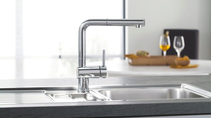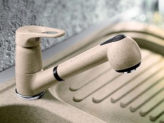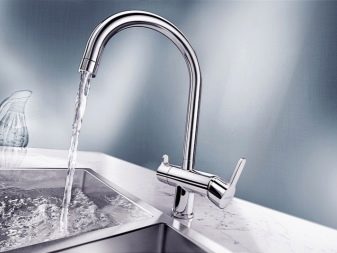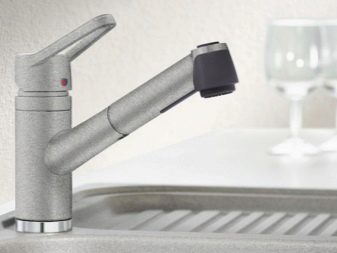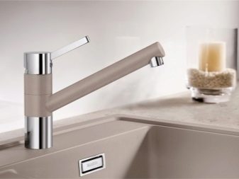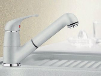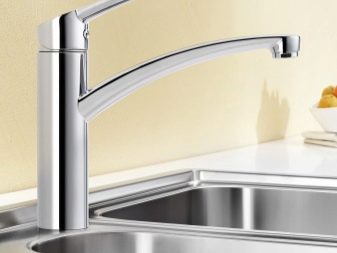 Устройства с един лост се предлагат в модели без издърпващ се чучур. За тяхното производство се използват хром, гранит, неръждаема стомана. Производителят представя опции с висок чучур, въртящ се на 360 и 130 градуса. Комплектът включва гъвкави маркучи, фиксираща плоча, закрепване.