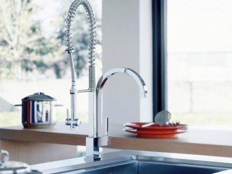 - версията на маркуча е по -подходяща за кухнята, защото лесно можете да я накарате да изтегли вода в желания тиган; също си струва да се обмисли висок кран, който ще ви позволи да поставите съдове с различни размери;