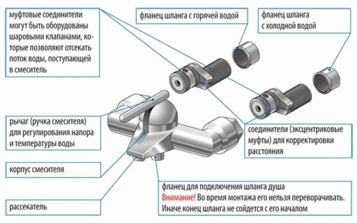 Смесителят за баня се различава от смесителя с различно предназначение по модифицирания дизайн на чучура и наличието на допълнителни части.