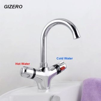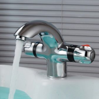 Смесителят с термостатични кранове се различава значително от останалите. Единият лост е предназначен за контрол на налягането на водата, а другият е предназначен за контрол на температурата на течността. Тази опция може да се счита за една от най -удобните, тъй като необходимия температурен индикатор и налягане се задават само веднъж и при следващото използване на тези данни тези данни просто ще се поддържат..