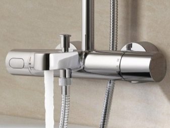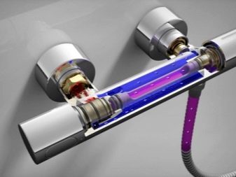 Смесителите с термостат са най -модерните модели. Те са оборудвани с месингово тяло, регулиращи устройства, термостат, клапанна кутия, превключвател и устройство за ръчно регулиране. Такъв продукт е оборудван и с блокер, който ограничава температурната граница. Комплектът включва и маркуч за душ за този тип смесител.