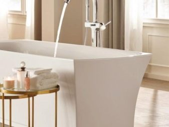Но за просторна стая подовият модел, оборудван с къдрава чучур, ще бъде най -добрият възможен начин. Би било препоръчително да комбинирате такъв миксер с красива купа в центъра на стаята. Такъв водопровод ще добави лукс и изисканост към банята..