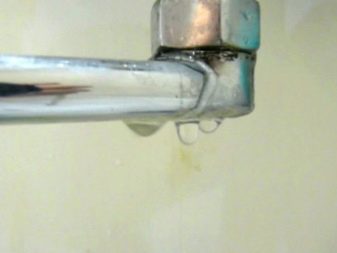 - От гандера на миксера. Възможна е една от двете причини или и двете едновременно. Първият е липсващите уплътнения на клапана поради нарушаване на тяхната цялост, износване, втвърдяване или деформация. Целостта може да бъде компрометирана чрез излагане на уплътнението на острите ръбове на седалката на клапана. Второто е износването на седалката и клапана, което се случва най -често в кранове с дълъг експлоатационен живот в резултат на корозия и механично (триене) действие на водата.