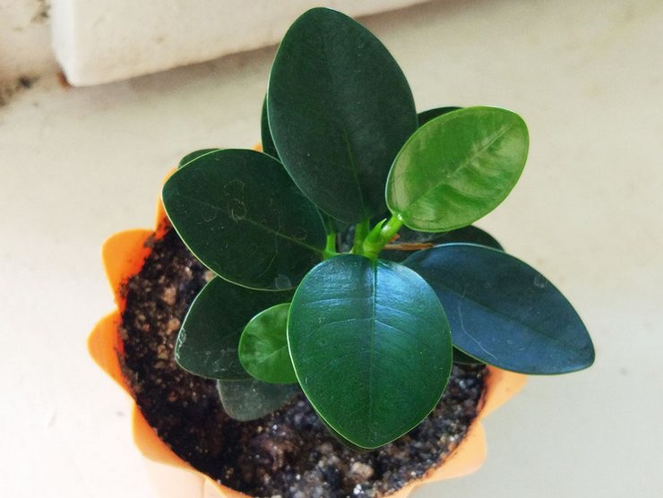 Små læderagtige blade ser meget flotte og pæne ud. Den gyldne farve på det unge løv giver indtryk af, at det udsender lys. Det begynder at vokse omkring slutningen af februar, og flere og flere nye blade dukker op under intensiv vækst. For deres farve fik planten sit andet navn – “gylden ficus”.
