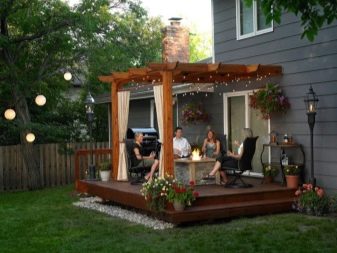 - Тераса. Съчетава функциите на веранда и кът за сядане за домакини и гости. Това е продължение на къщата, която е защитена с покрив, допълнен от огради и малко стълбище. Основната разлика между терасата и верандата е голяма площ, която ви позволява да поставите градински мебели, саксии и други декоративни елементи.
