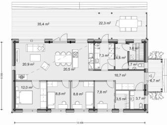 Скандинавската къща (15,4 x 8 m) с наклонен покрив е надарена с голяма тераса, която се простира по цялата дължина на сградата. Вилата има 3 изхода: от входното антре до верандата, разположена в края на сградата, и 2 към терасата от голяма стая (хол-кухня) и от територията на банята. По дължина къщата може условно да бъде разделена на две части: вляво – спалнята на родителя, две детски стаи, офис и баня, вдясно – голяма стая, която едновременно функционира като коридор, кухня и трапезария. Комплекс за баня се намира на входа от дясната страна: сауна, съблекалня, тоалетна, стая за отдих с достъп до терасата.