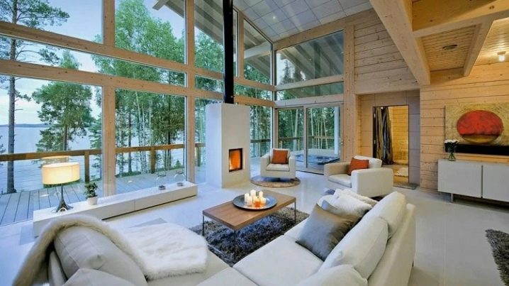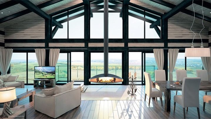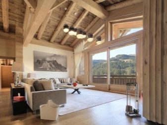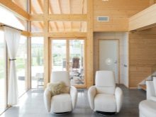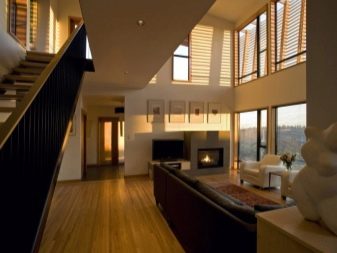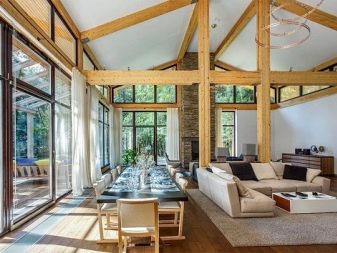 Освен това всички отворени елементи на рафтовата система, както и дистанционни елементи, допринасят за зонирането на пространството. Прозорците на второто ниво в такива къщи са поставени в една равнина, а гредите, фиксирани в района на втория етаж, от своя страна визуално разделят това остъкляване на няколко нива.