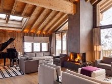 - уютна дървена къща а ла хижа с голяма камина – този интериор предизвиква асоциации с почивка в планината;