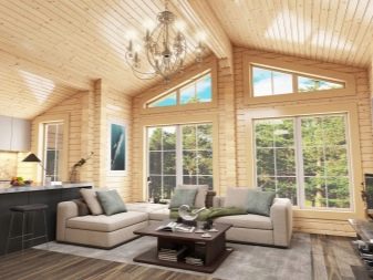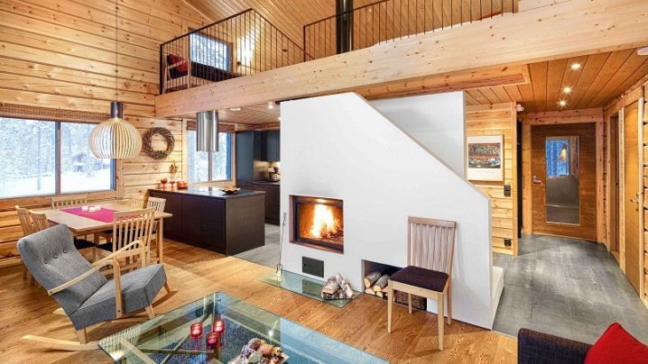 - обемна стая лесно се поддава на функционално зониране, в такова пространство можете да поставите удобна зона за сядане близо до камината, всекидневна зона, както и кухненски блок с трапезария;