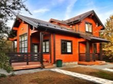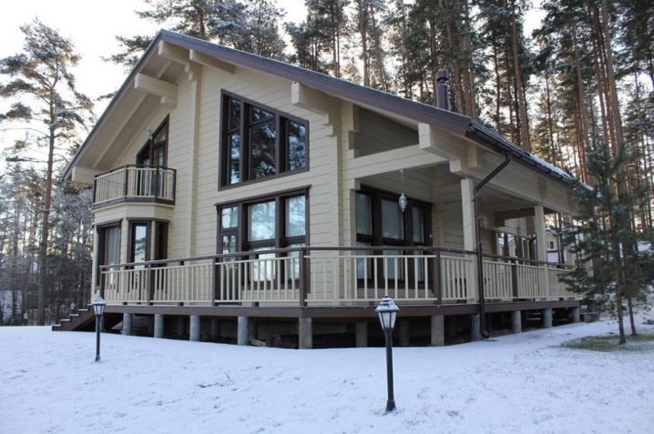 По цялата конструкция е монтирана просторна тераса. Такава къща, като правило, има скатен покрив, който, за съжаление, води до натрупване на голямо количество сняг през зимата..